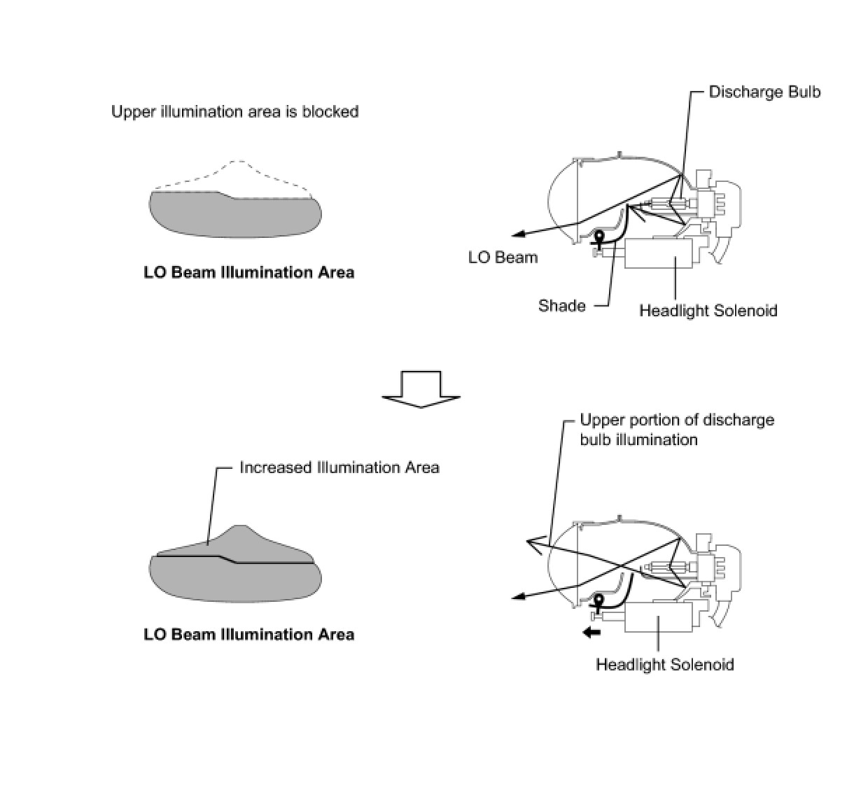 When the LO beam headlight is switched on, the upper illumination area of the discharge bulb is blocked by the shade and only the lower illumination area is used. When the HI beam is turned on, the headlight solenoid slides the shade down to allow use of the upper illumination area, thus increasing the illumination area and improving visibility when the HI beam is on.