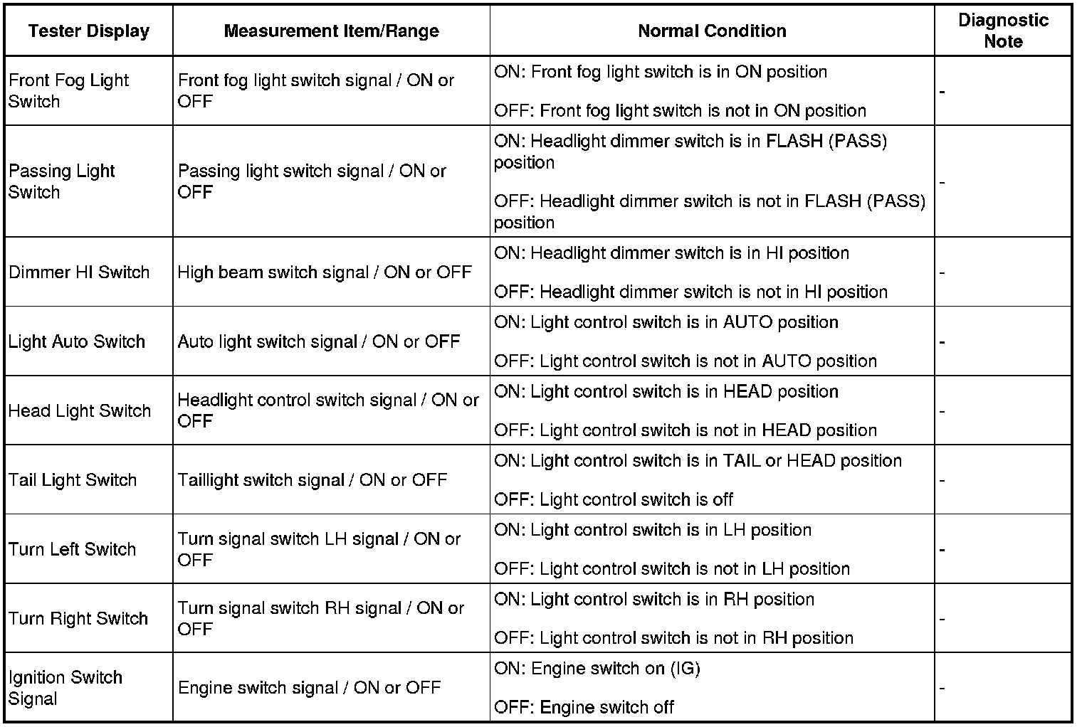 (d) Enter the following menus: Body Electrical / Combination Switch / Data List.