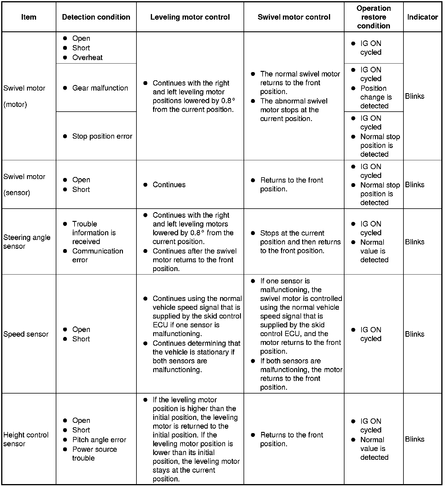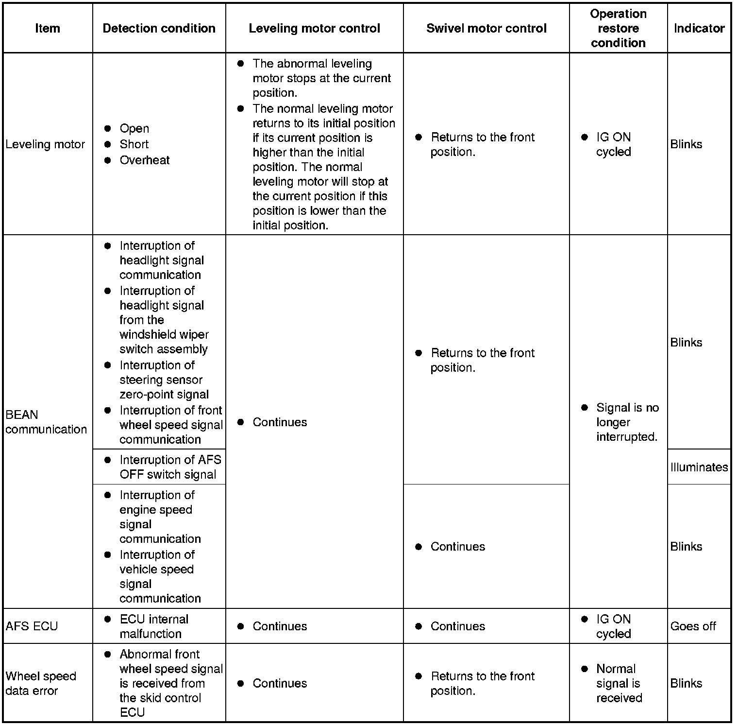 If a malfunction is detected, the headlight swivel ECU assembly (AFS ECU) performs fail-safe operation. Depending on the malfunction, the ECU flashes at 1 Hz intervals or illuminates the AFS OFF indicator in the combination meter assembly. Warning massages are also shown on the multi-information display.