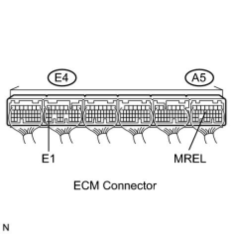 When the engine switch is turned on (IG), the battery voltage is applied to terminal IGSW of the ECM. The ECM MREL output signal causes a current to flow to the coil, closing the contacts of the EFI MAIN relay and supplying power to terminal +B and +B1 of the ECM.