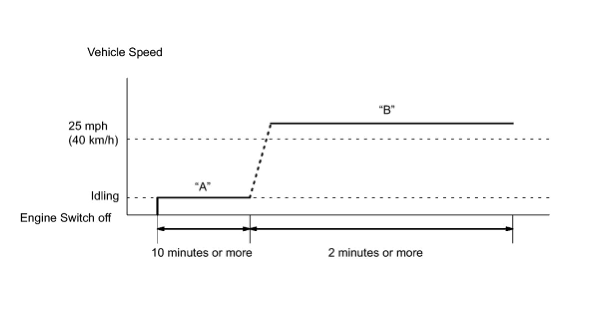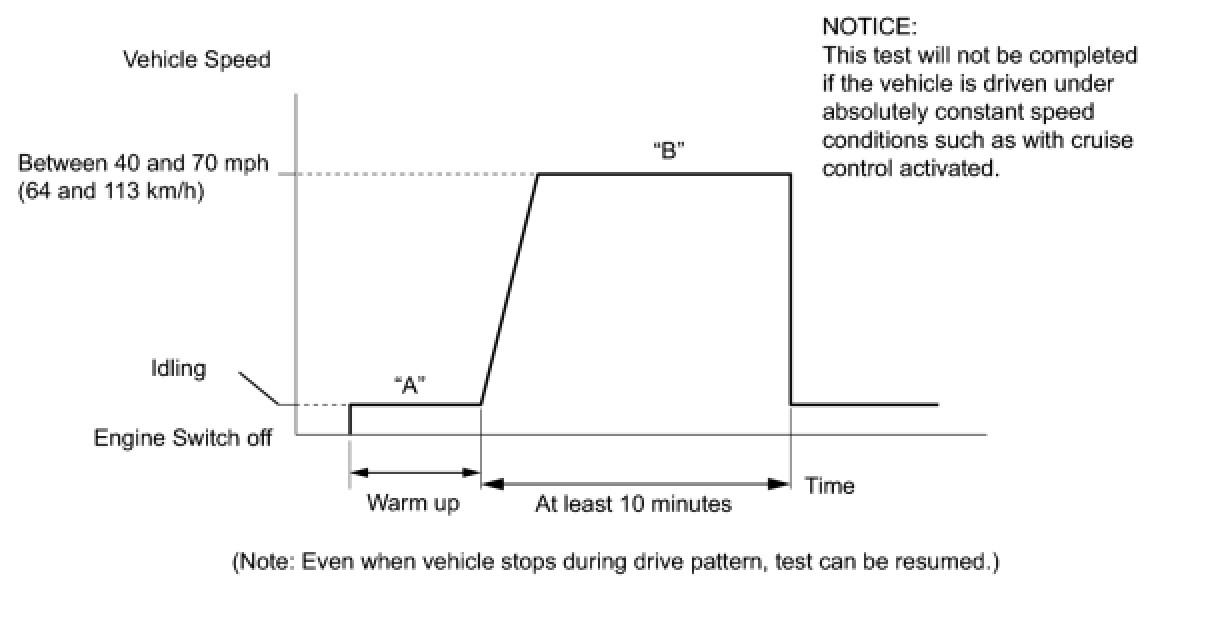 Drive the vehicle at between 40 mph and 70 mph (64 km/h and 113 km/h) for at least 10 minutes (Procedure "B")