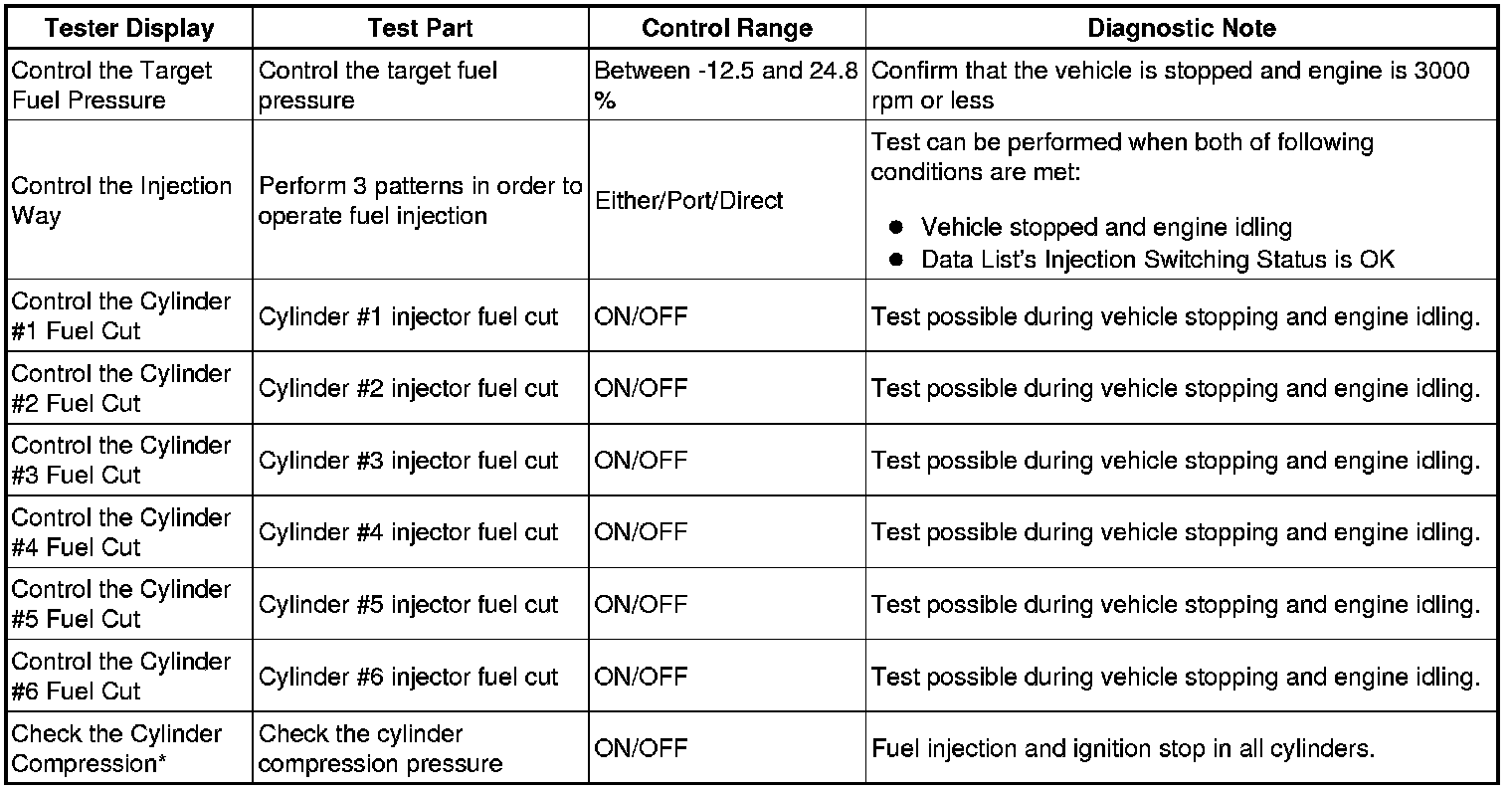 *: When cranking the engine, each cylinder measures the engine rpm. In this Active Test, the fuel and ignition of all cylinders are cut, and cranking occurs for approximately 10 seconds. Then, each cylinder measures the engine rpm. If a cylinder's engine rpm is higher than the others, that cylinder's compression pressure is compared to the others, and is determined whether it is low or not.