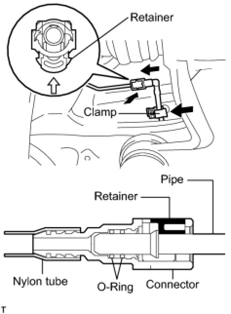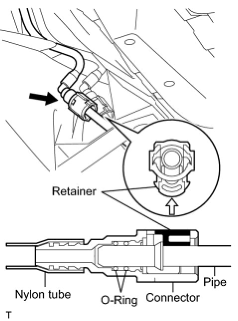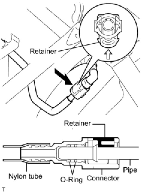 (1) Push in the fuel tube connector to the pipe and push up the retainer to engage the claws.
