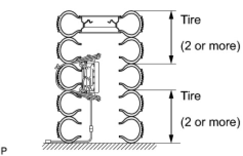 (1) Place at least 2 tires under the tire which the front passenger airbag assembly is tied to.