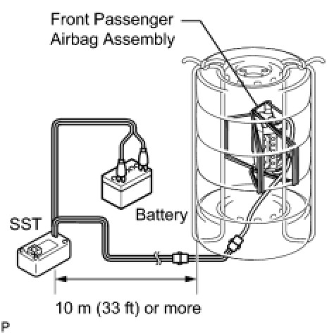 - When deploying the airbag, perform the operation at least 10 m (33 ft.) away from the front passenger airbag assembly.