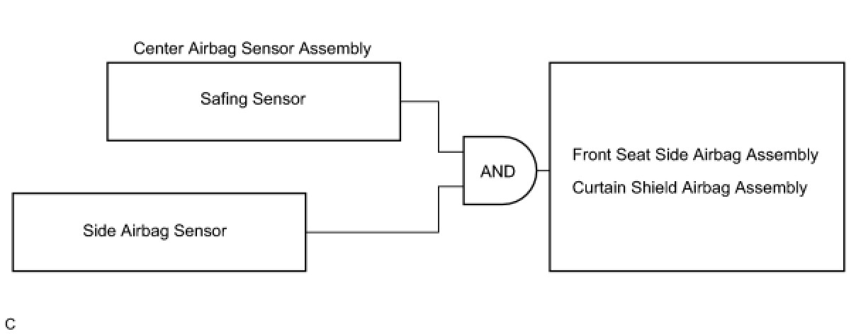 (e) In this system, a front side collision is detected by the side airbag sensor in order to simultaneously deploy the front seat side airbags and the curtain shield airbags. A rear side collision is detected by the rear airbag sensor and the center airbag sensor assembly in order to deploy the curtain shield airbags.