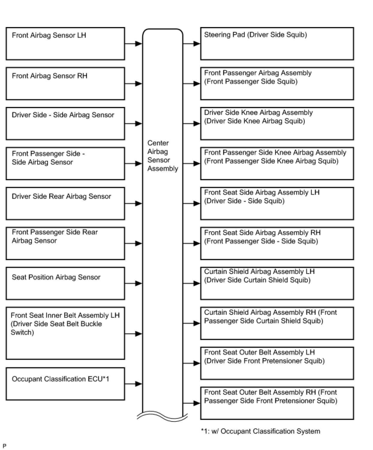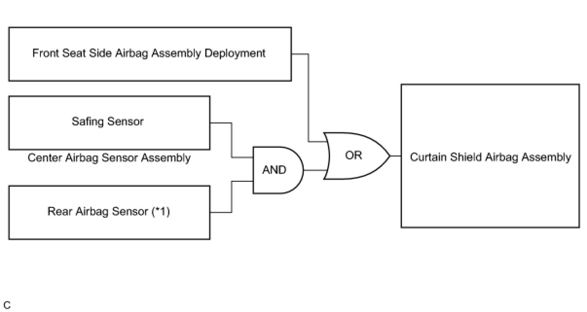 *1: If the front seat airbag assembly deploys, the curtain shield airbag assembly will also deploy, regardless of whether the signal is output from the rear airbag sensor.