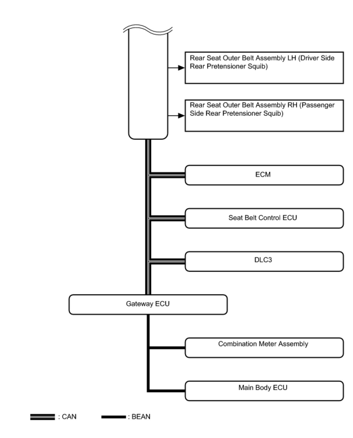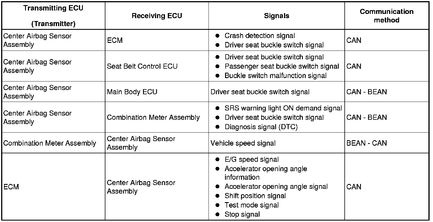 - The center airbag sensor assembly sends the airbag deployment signal to the main body ECU through the discrete line to operate collision door lock release control.
