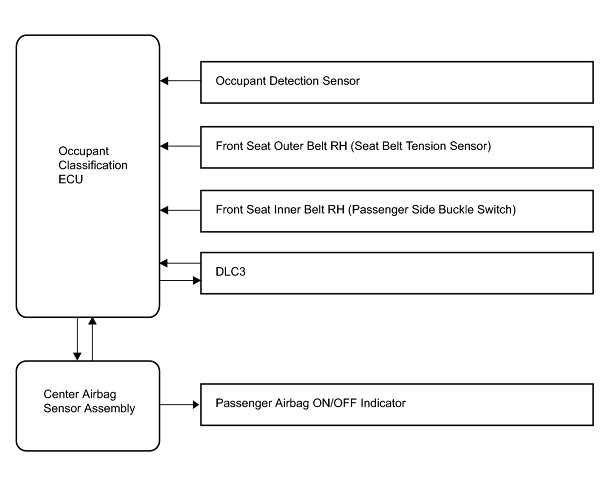 (b) This system is mainly composed of the occupant detection sensor that detects the load on the front passenger seat. The occupant classification ECU controls the system, and the passenger airbag ON/OFF indicator indicates the ON/OFF condition of the front passenger airbag and front passenger side - side airbag.