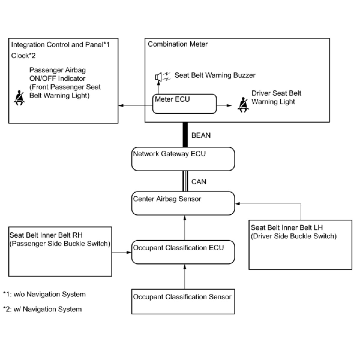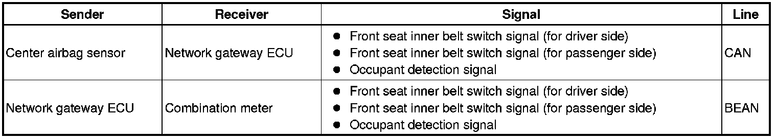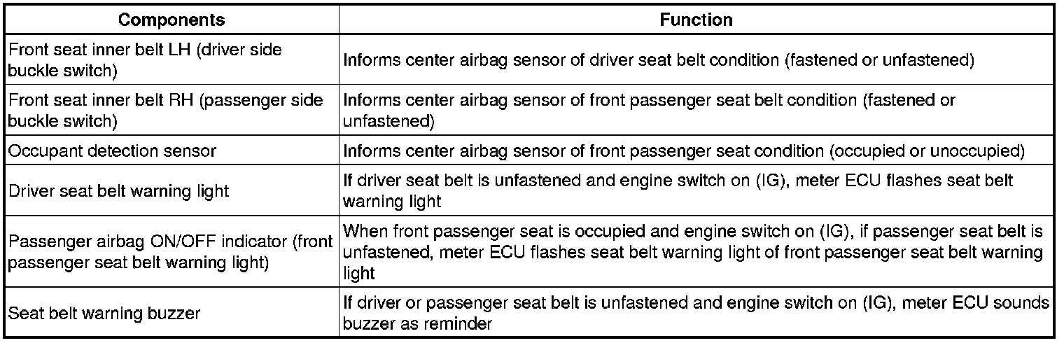 (1) When the driver seat belt is not fastened with the engine switch on (IG), the driver seat belt warning light on the combination meter comes on to inform the driver. The center airbag detects the driver seat belt status and sends signals to the combination meter using CAN/BEAN.