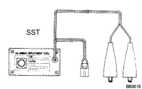 - When deploying the seat belt pretensioner, always use the specified SST (SRS airbag deployment tool). Perform the operation in a place away from electrical interference.