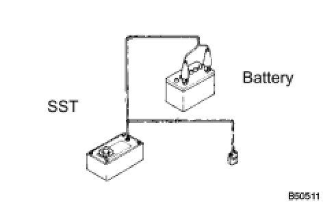 (2) Connect the red clip of the SST to the battery positive (+) terminal and the black clip to the negative (-) terminal.