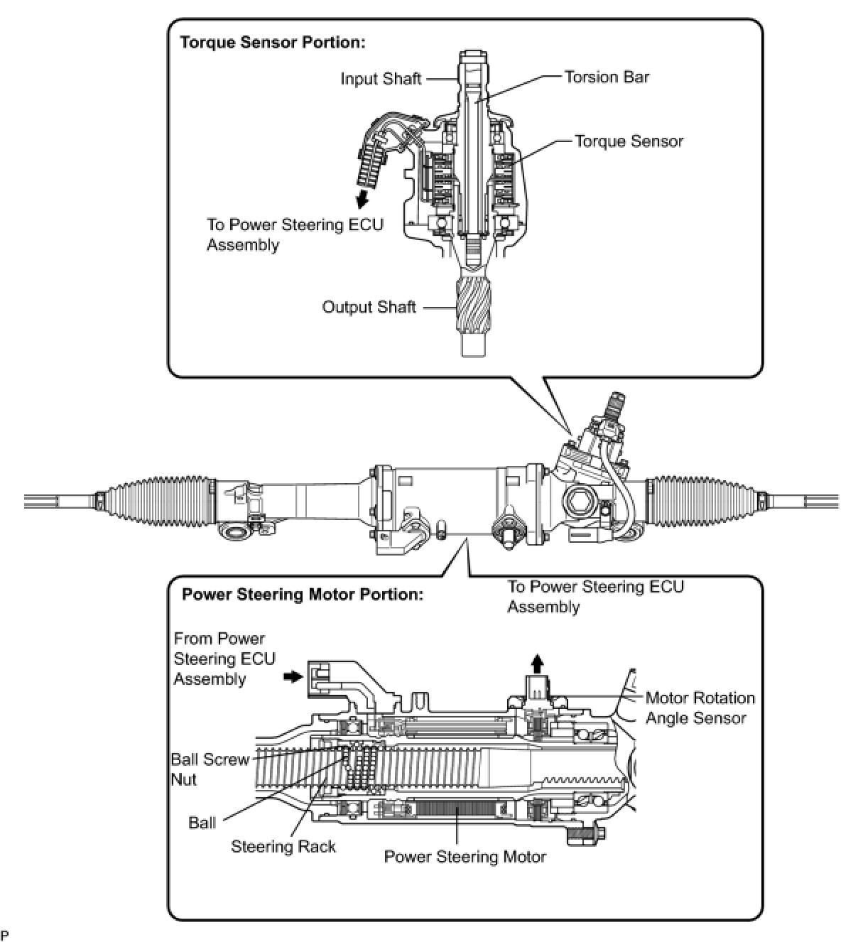 (b) If the steering wheel is turned, the torsion bar twists, resulting in a difference in the rotation angle detected by torque sensor. The power steering ECU assembly calculates torque based on this difference.