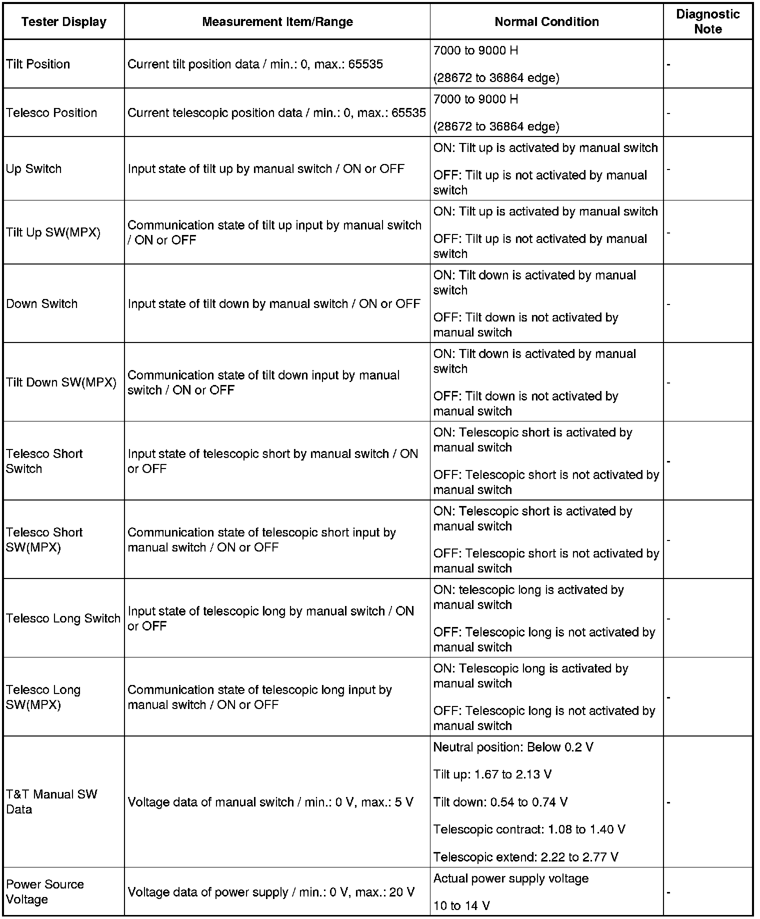 (e) Check the freeze frame data. Enter the following menus: Chassis / Tilt&Telescopic / Utility / Freeze Frame Data.