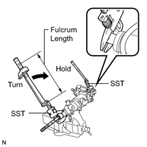 Using SST, hold the steering rack and install the steering rack end sub-assembly.