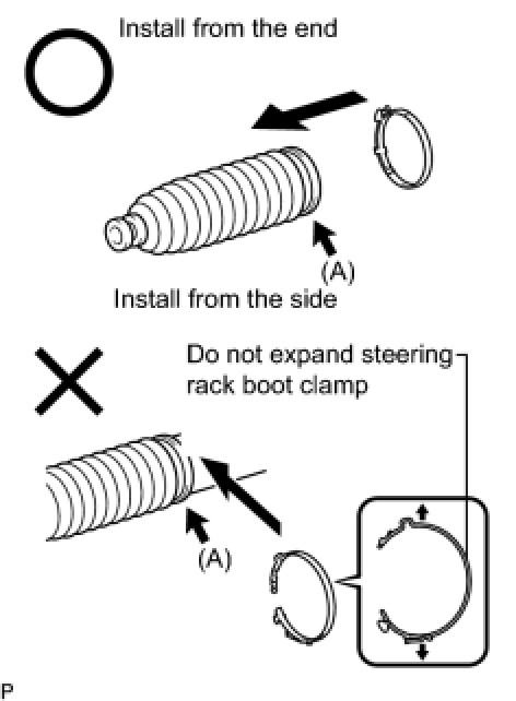 - Tightening force of the No. 1 steering rack boot clamp becomes uneven if it is installed after being expanded as shown in the illustration. As a result, rust is caused by water entering from the clearance between the No. 1 steering rack boot and rack housing, causing a malfunction.