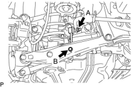 (a) Install the stabilizer link assembly LH to the rear No. 2 suspension arm and height control sensor link bracket with the bolt and nut (B).