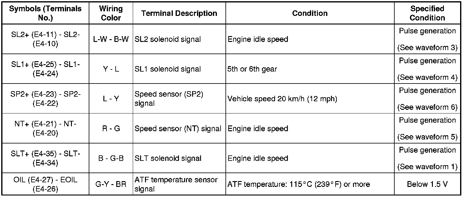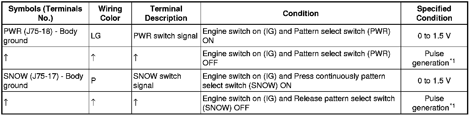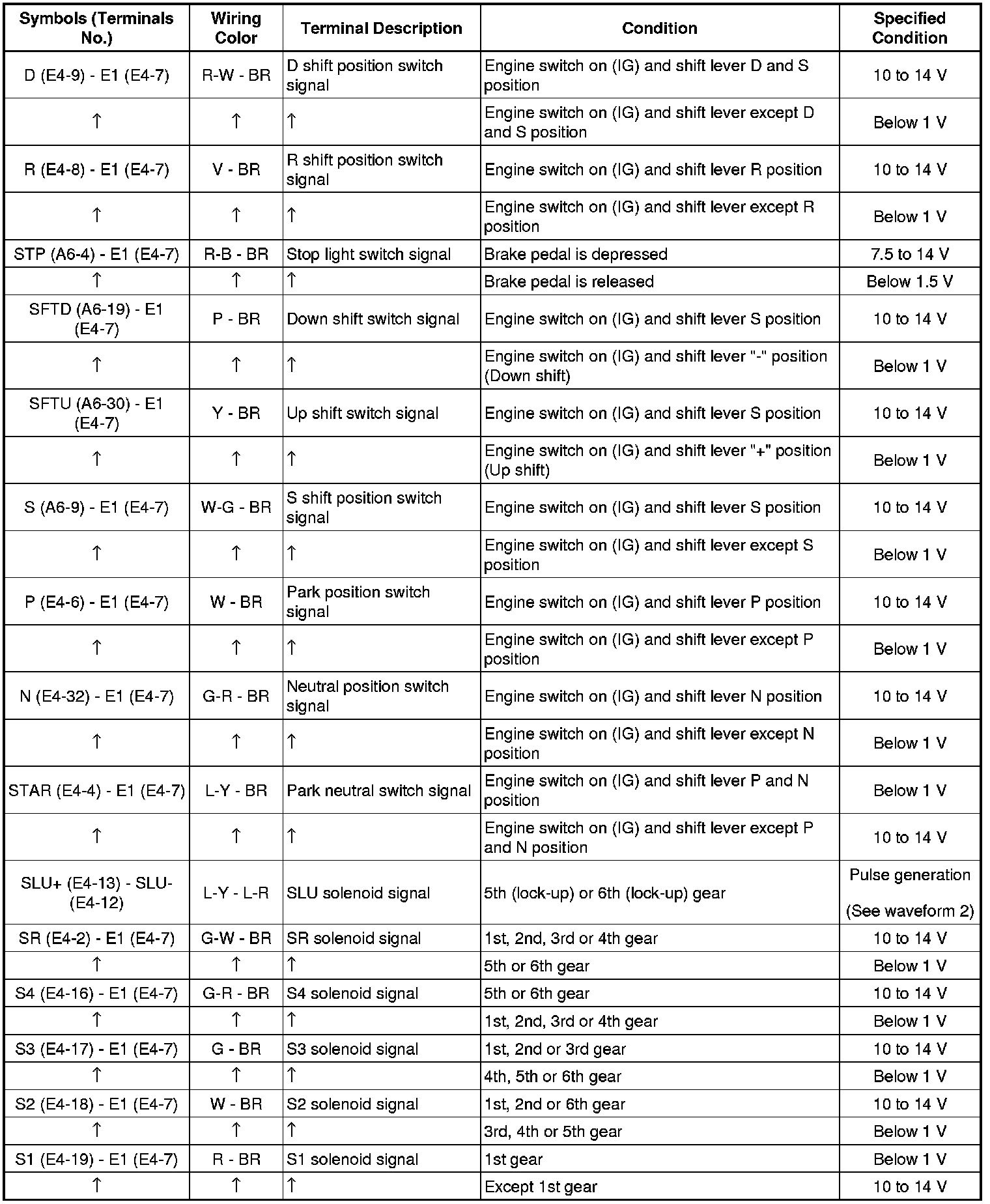 In the table, first follow the information under "Condition". Look under "Symbols (Terminal No.)" for the terminals to inspected. The standard voltage between the terminals is shown under "Specific Condition".