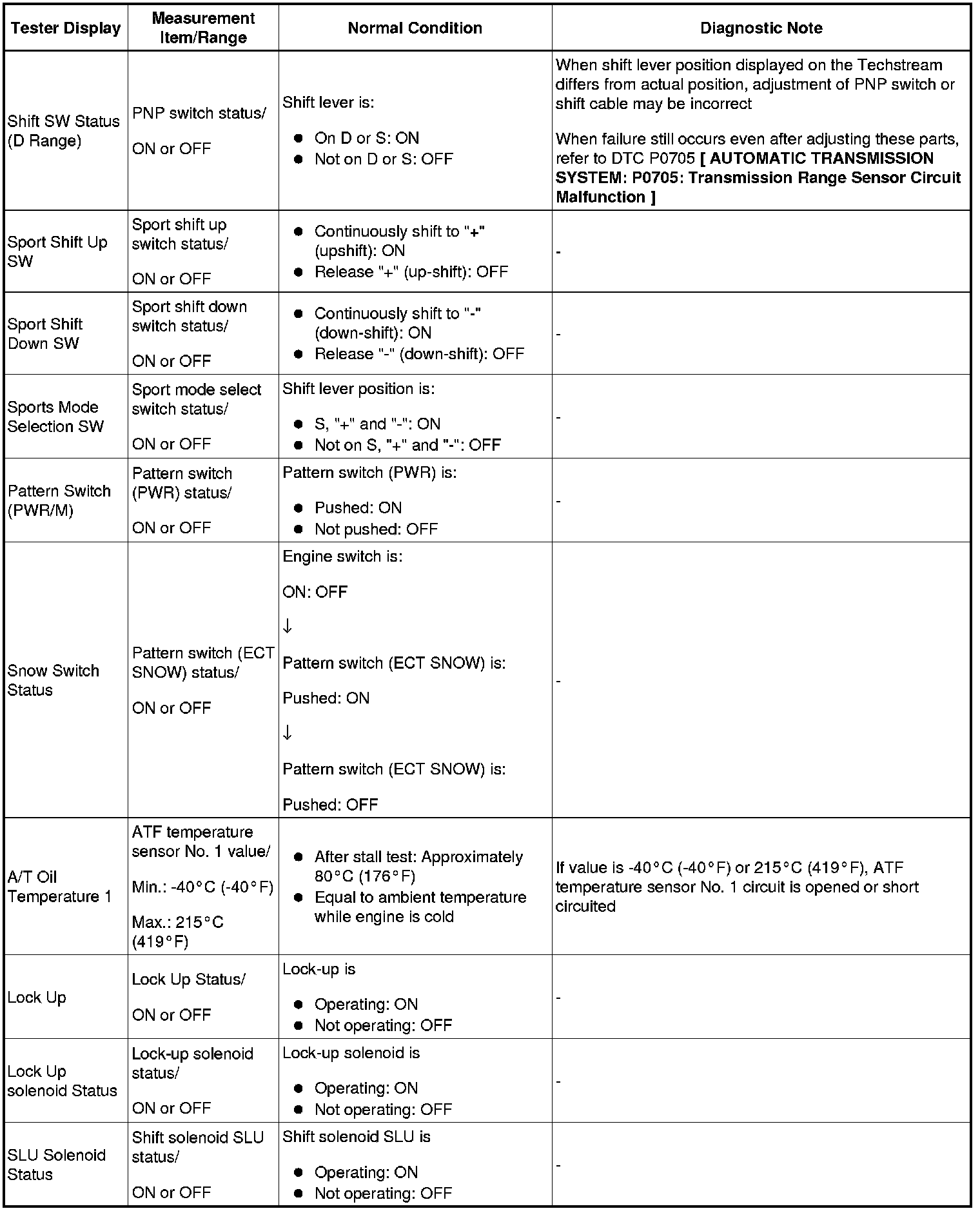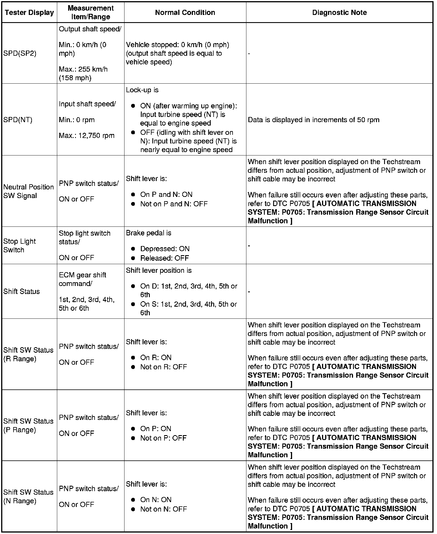 Using the Techstream to read the Data List allows the values or states of switches, sensors, actuators and other items to be read without removing any parts. This non-intrusive inspection can be very useful because intermittent conditions or signals may be discovered before parts or wiring is disturbed. Reading the Data List information early in troubleshooting is one way to save diagnostic time.