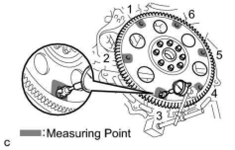 (b) Set up a dial indicator and measure the runout of the 6 portions around the torque converter fitting surfaces.