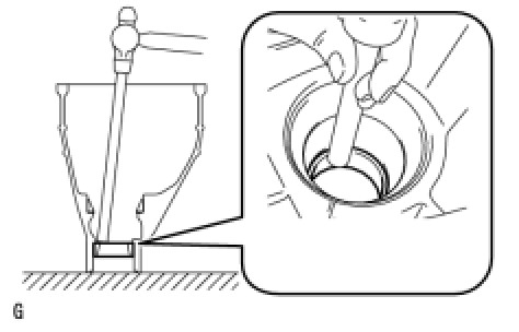 (b) Using a brass bar and a hammer, remove the rear drive pinion front tapered roller bearing outer race from the differential carrier.