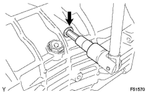 (a) Using a socket hexagon wrench (10 mm), remove the shift detent ball plug from the rear transmission case.