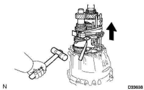 (b) Using a plastic hammer, carefully tap out the center transmission case sub-assembly.