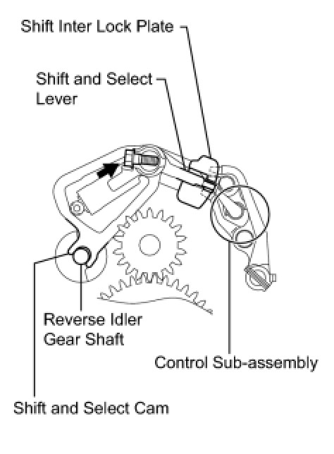 (d) Align the shift inter lock plate and shift and select lever with the head of the control sub-assembly and insert the shift and select lever shaft to the front transmission case.