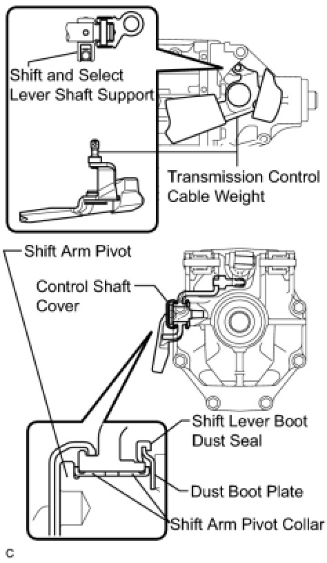 When tightening the shift arm pivot, position the arrow-shaped portion of the transmission control cable weight up, and insert it to the groove of the shift and select lever shaft support.