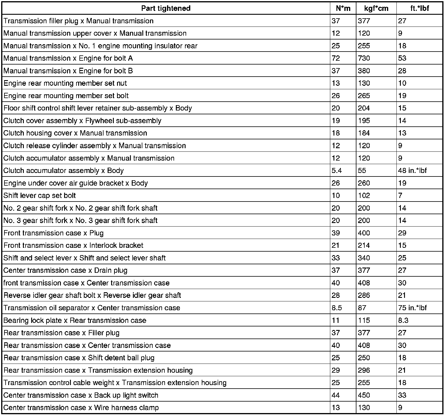 SERVICE SPECIFICATIONS: RA62 MANUAL TRANSMISSION: TORQUE SPECIFICATIONS