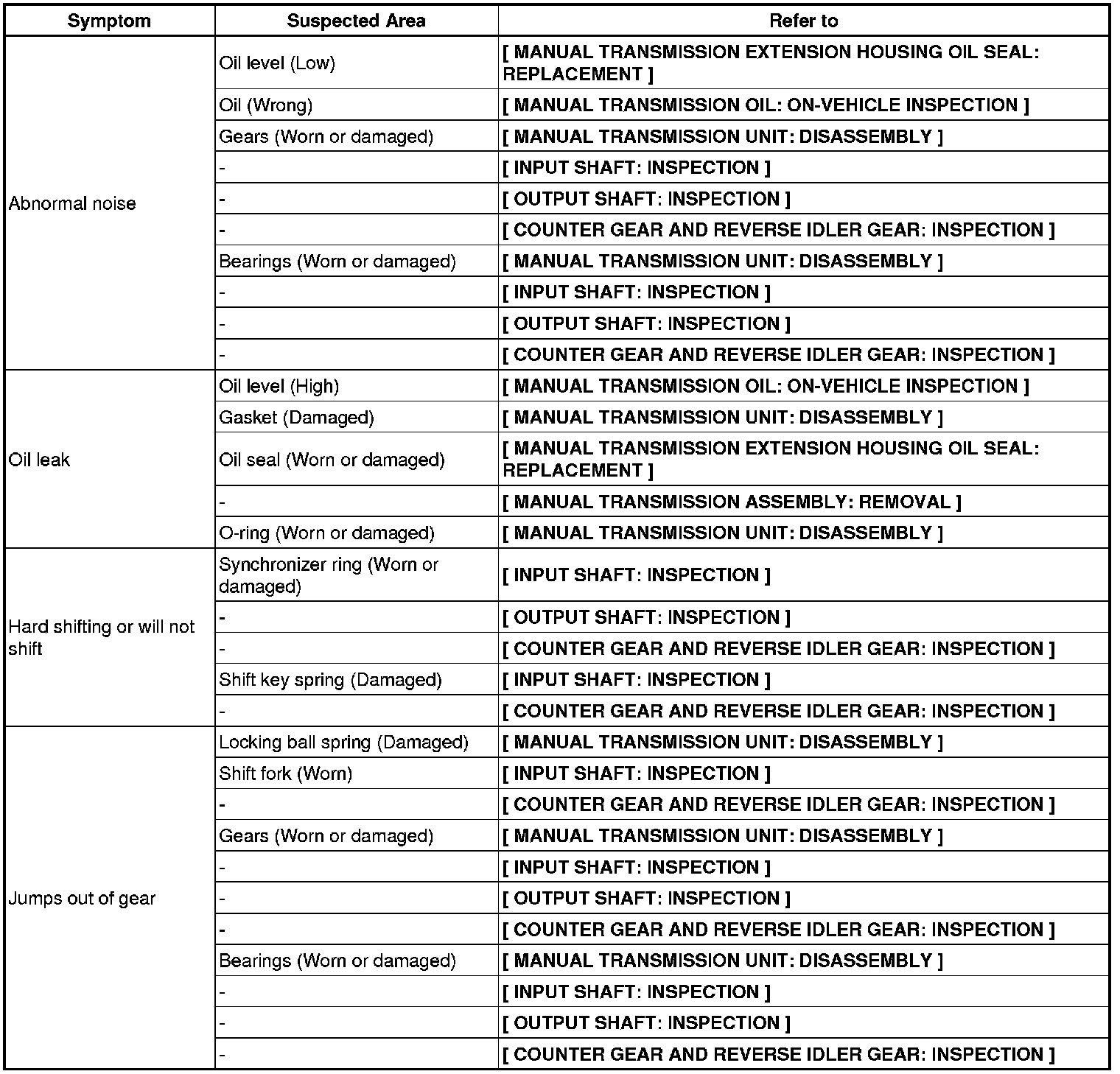 RA62 MANUAL TRANSMISSION: MANUAL TRANSMISSION SYSTEM: PROBLEM SYMPTOMS TABLE