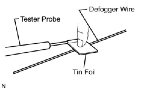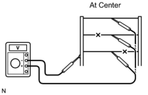 (c) Check the voltage at the center of each defogger wire, as shown in the illustration.