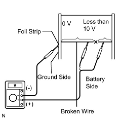 If the defogger wire is not broken, the voltmeter should indicate 0 V at the positive (+) end of the defogger wire but gradually increases to approximately 12 V as the meter probe moves to the other end.