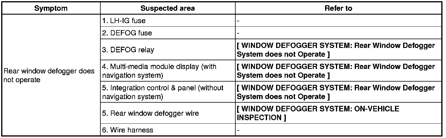 / WINDOWGLASS: WINDOW DEFOGGER SYSTEM: PROBLEM SYMPTOMS TABLE