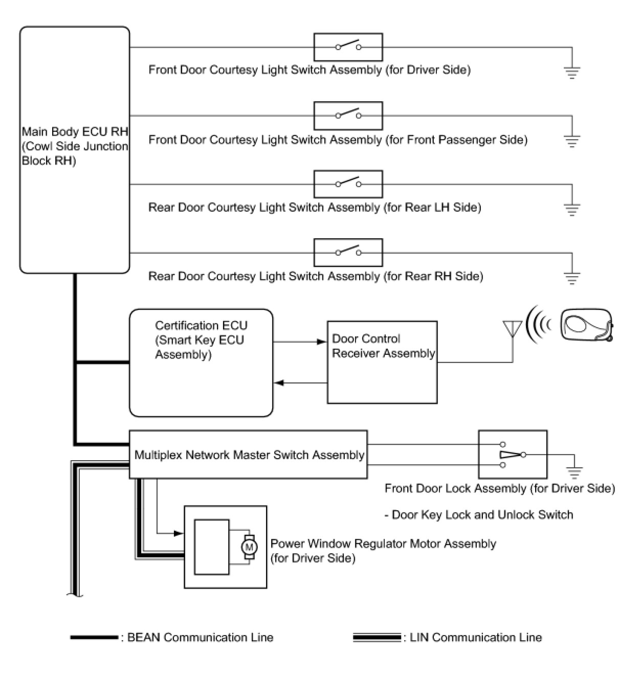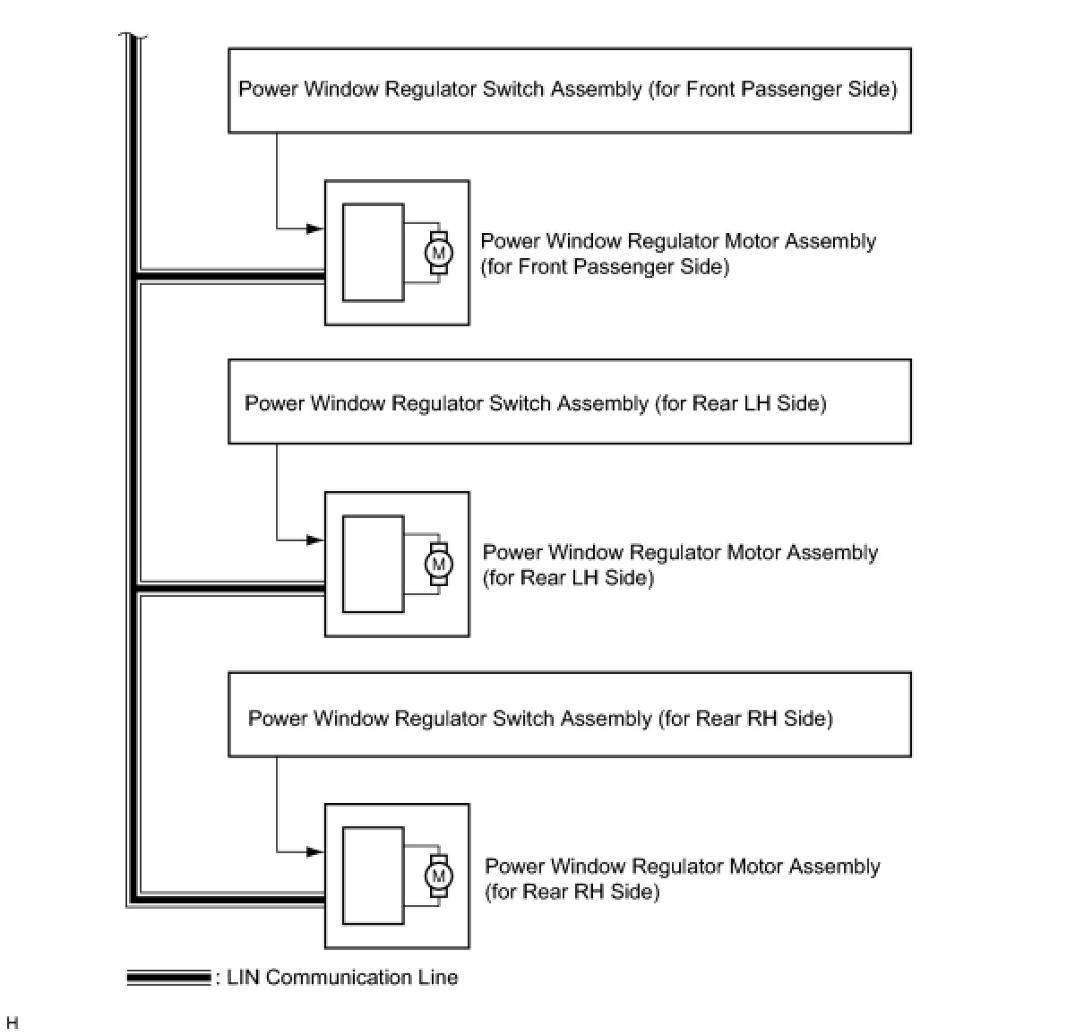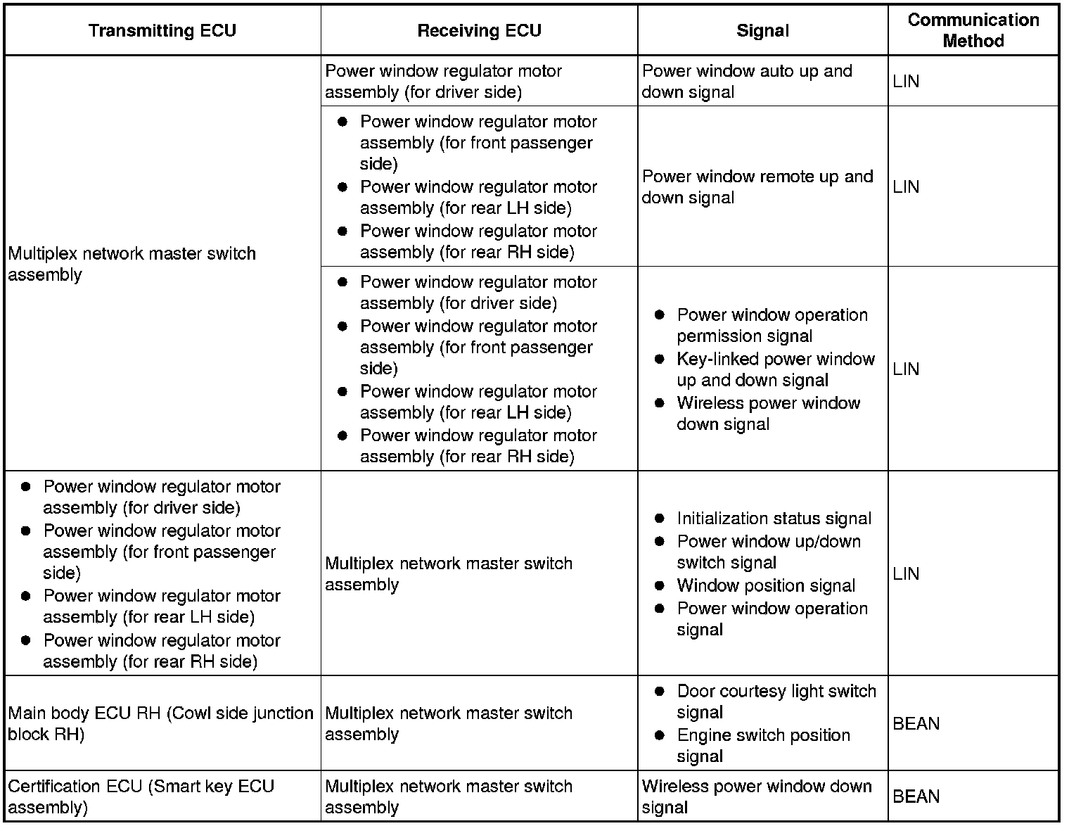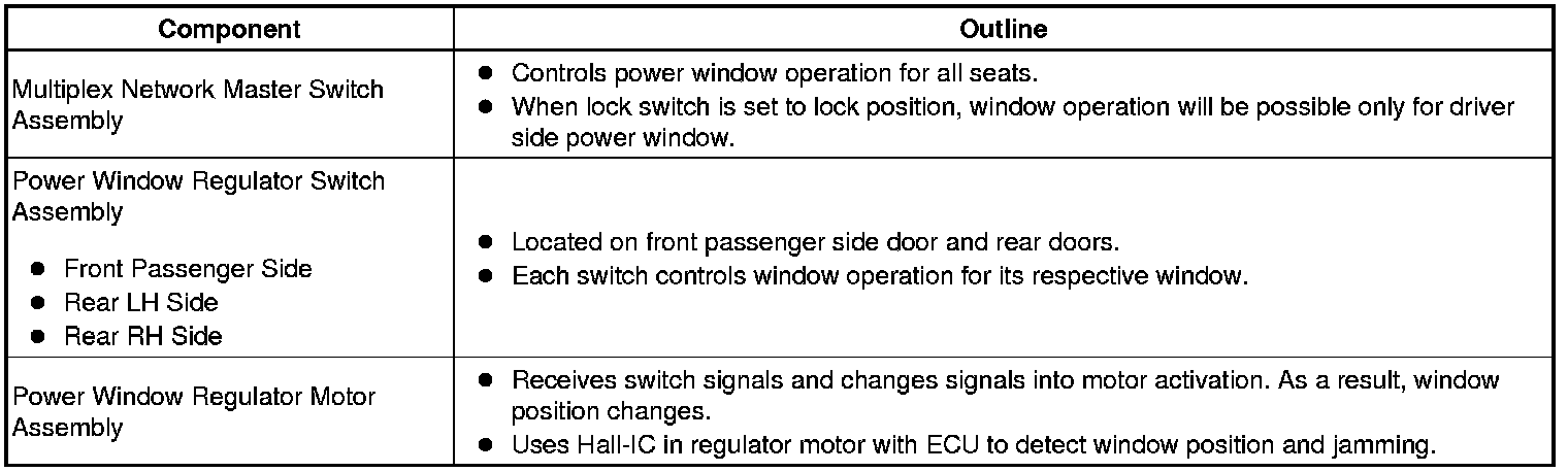 (a) The power window control system controls the power window operation using the power window regulator motors. The main controls of this system are the multiplex network master switch assembly, which is mounted on the driver side door, and the power window regulator switches, which are mounted on the front passenger side door and rear doors. Operating a window switch results in electrical power being transmitted to the corresponding power window regulator motor.
