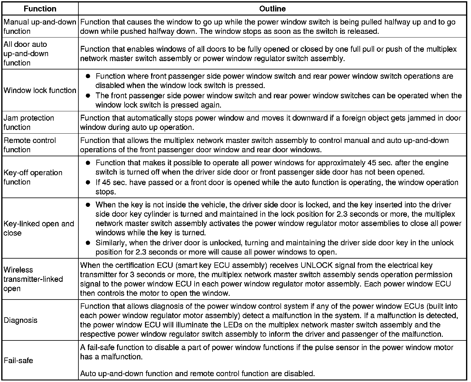 The power window control system has the following functions: