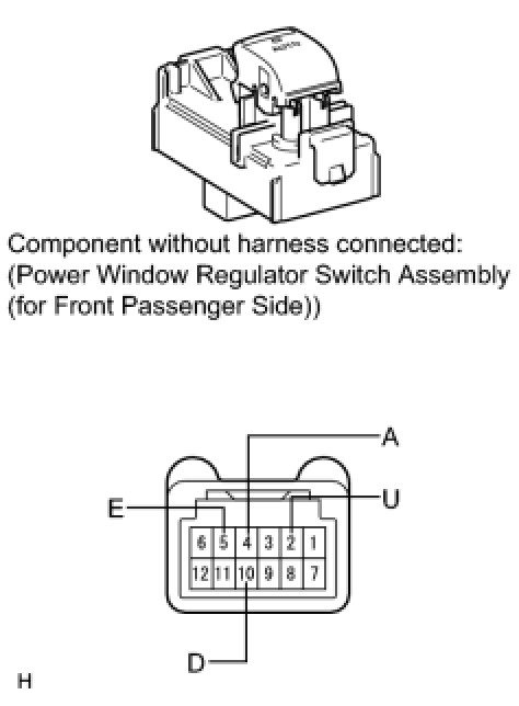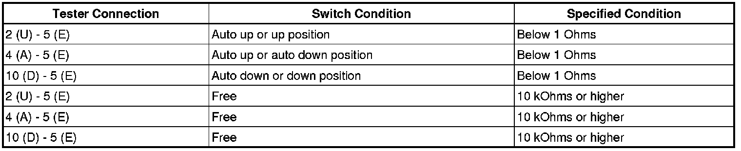 If the result is not as specified, replace the power window regulator switch assembly (for front passenger side).