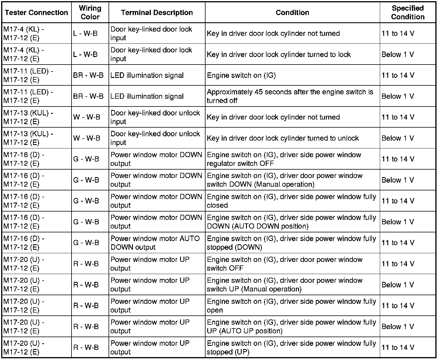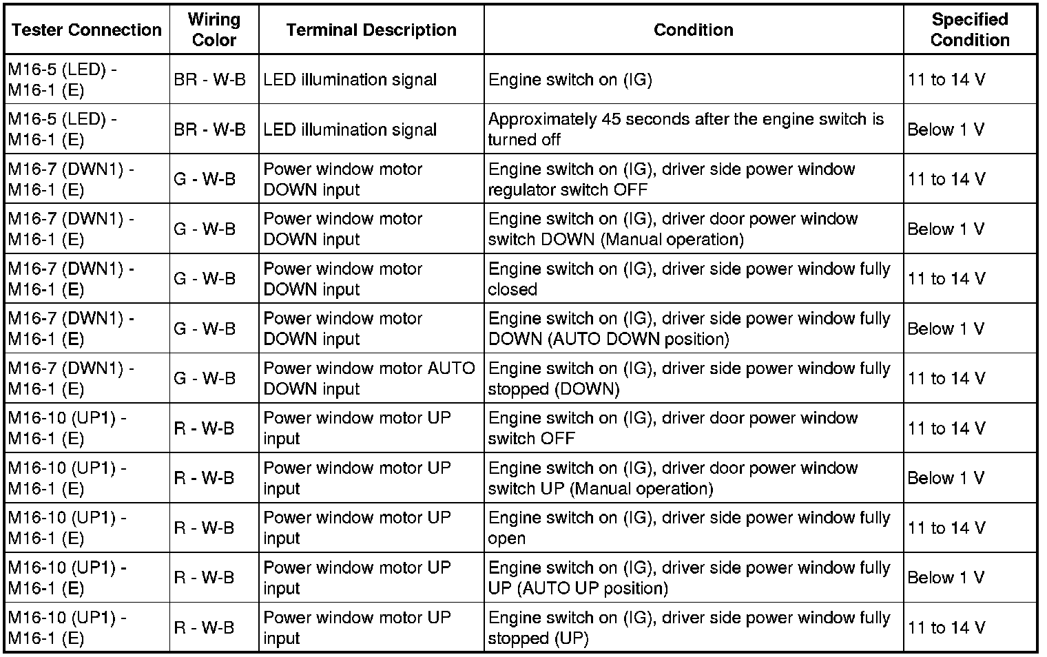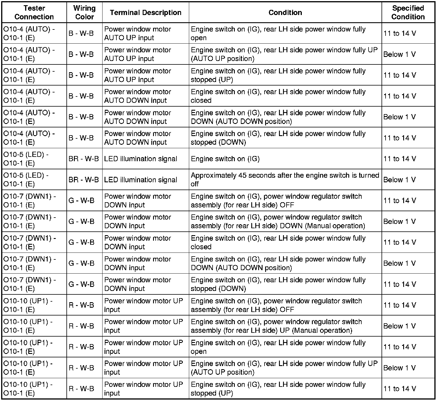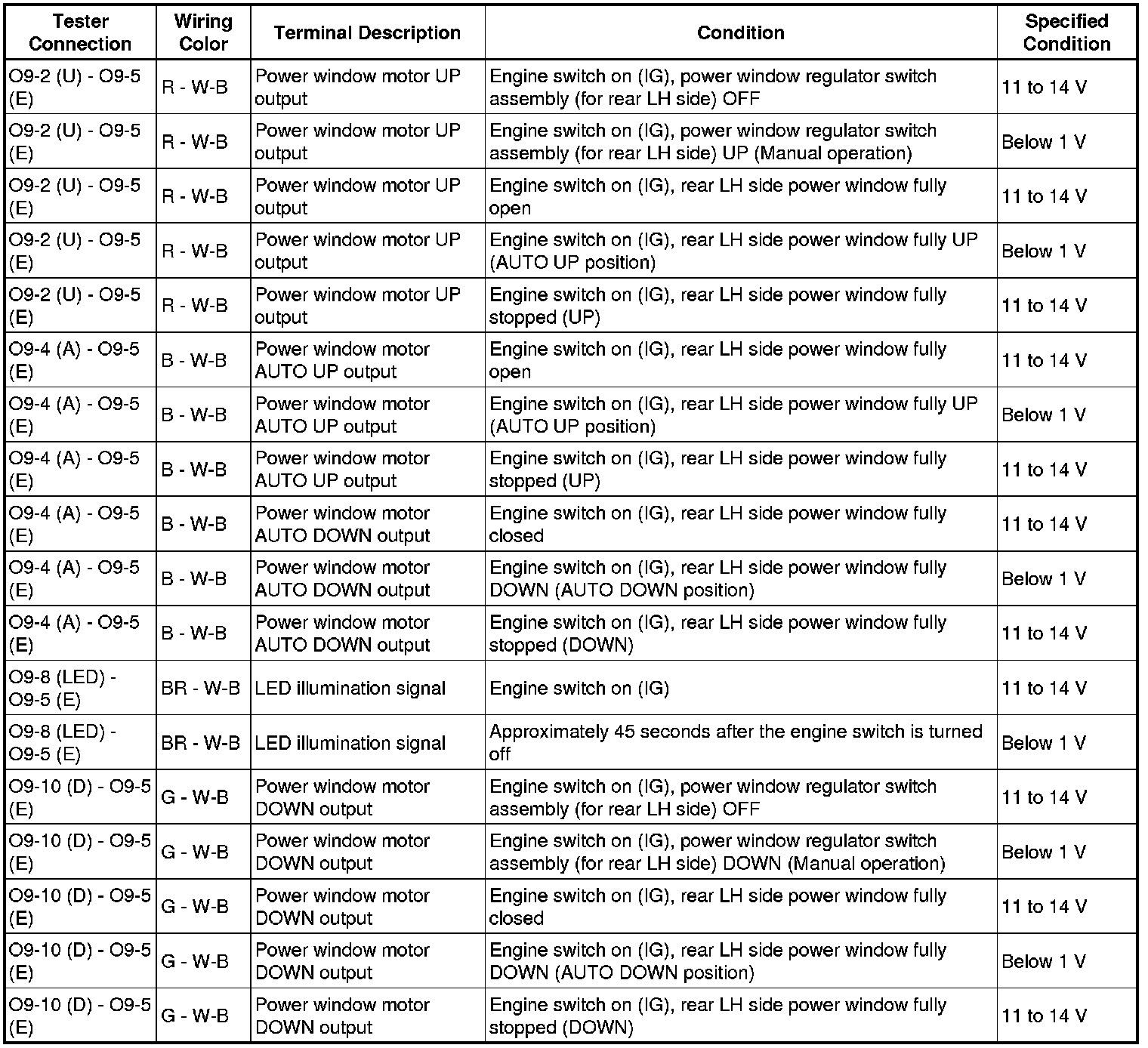 If the result is not as specified, the power window regulator motor assembly (for rear LH side) may have a malfunction.