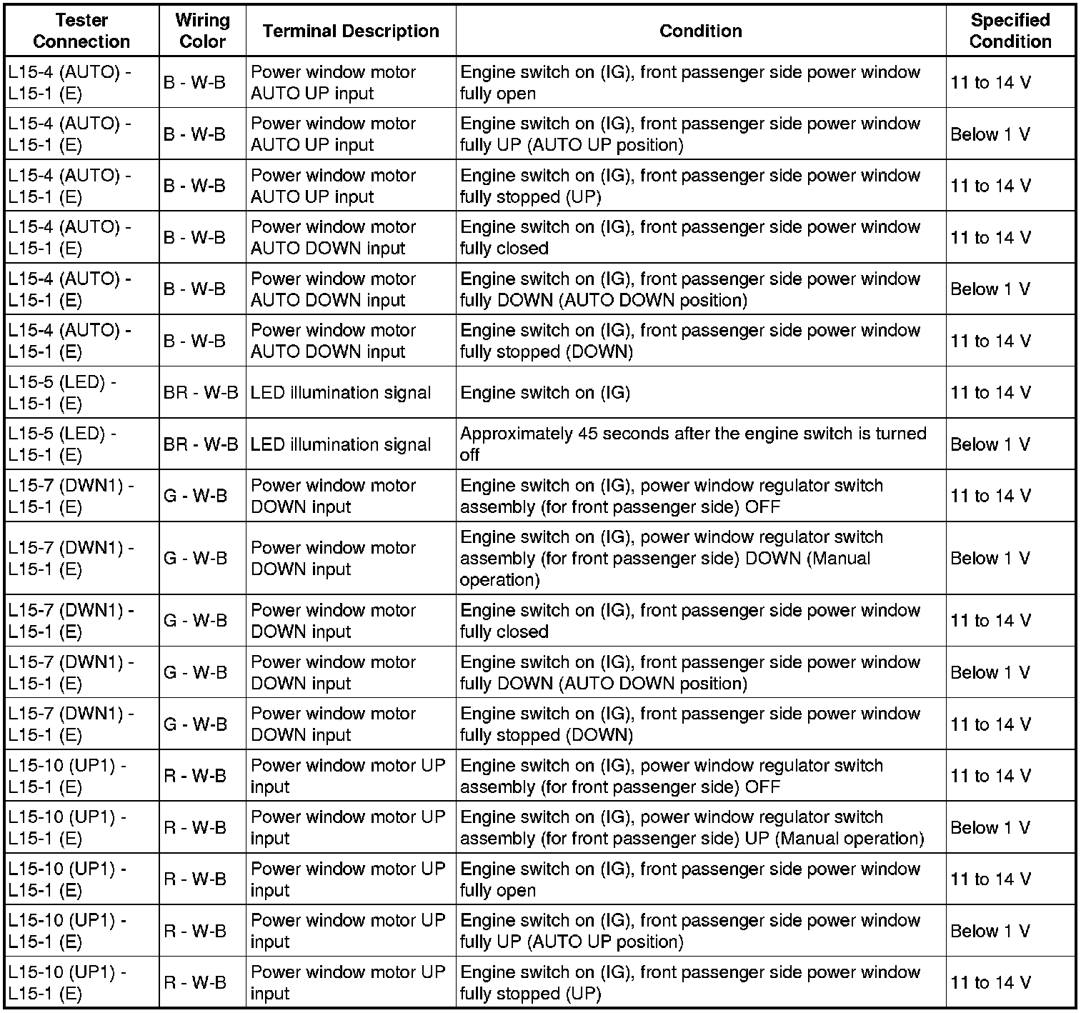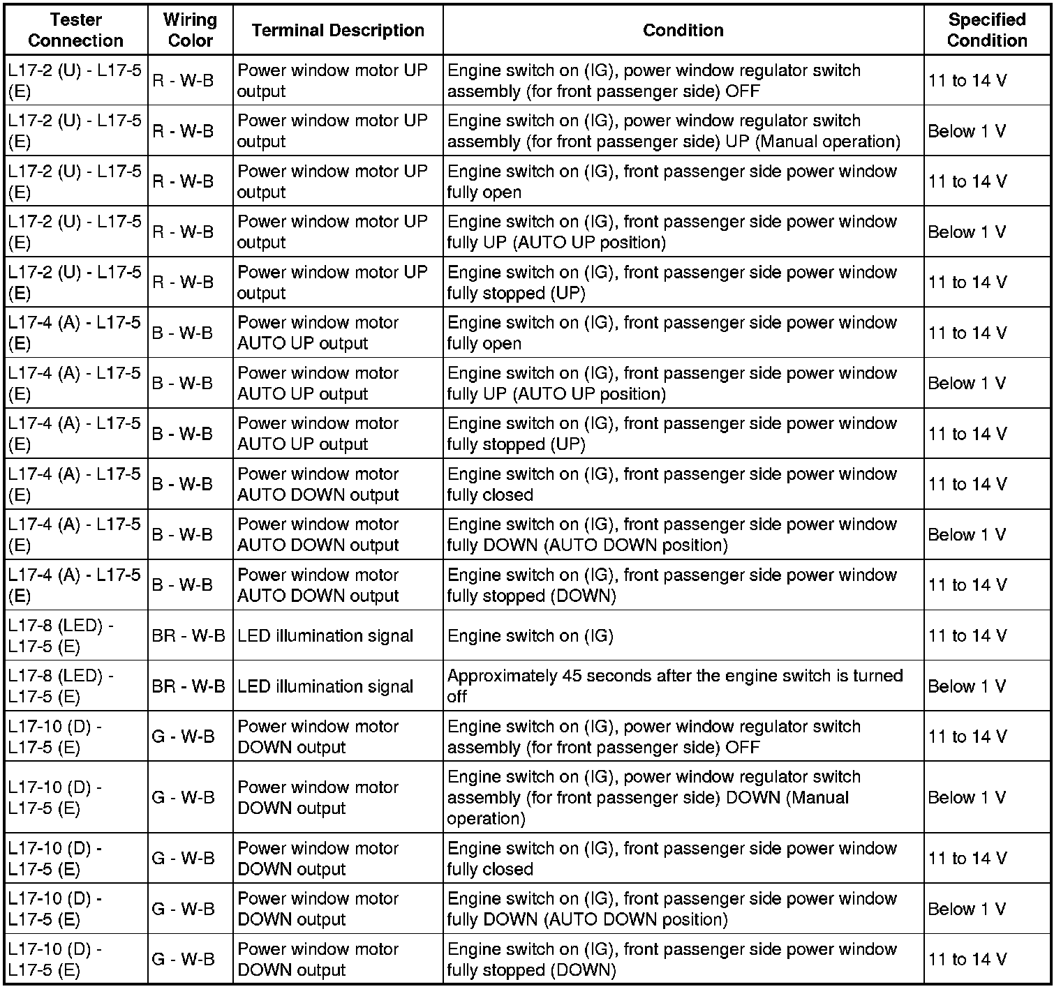 If the result is not as specified, the power window regulator switch assembly (for front passenger side) may have a malfunction.