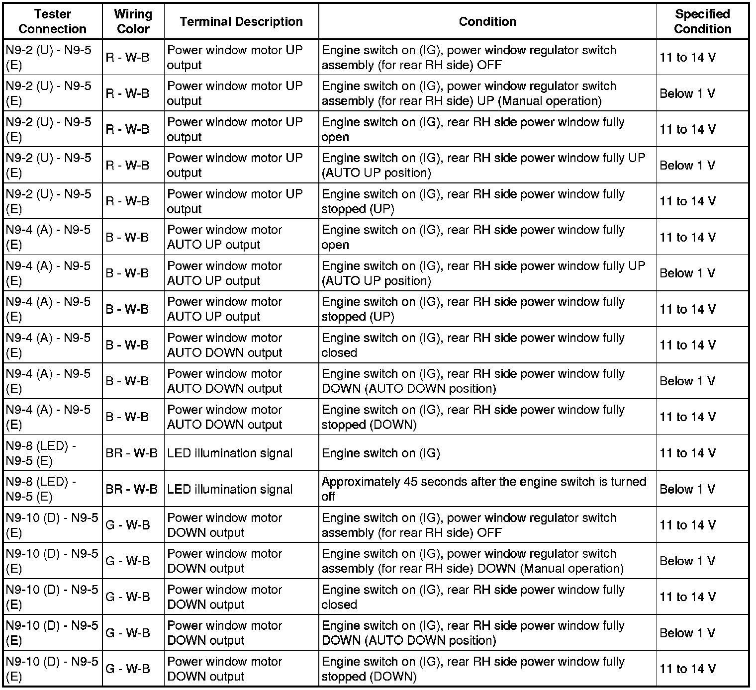 If the result is not as specified, the power window regulator motor assembly (for rear RH side) may have a malfunction.