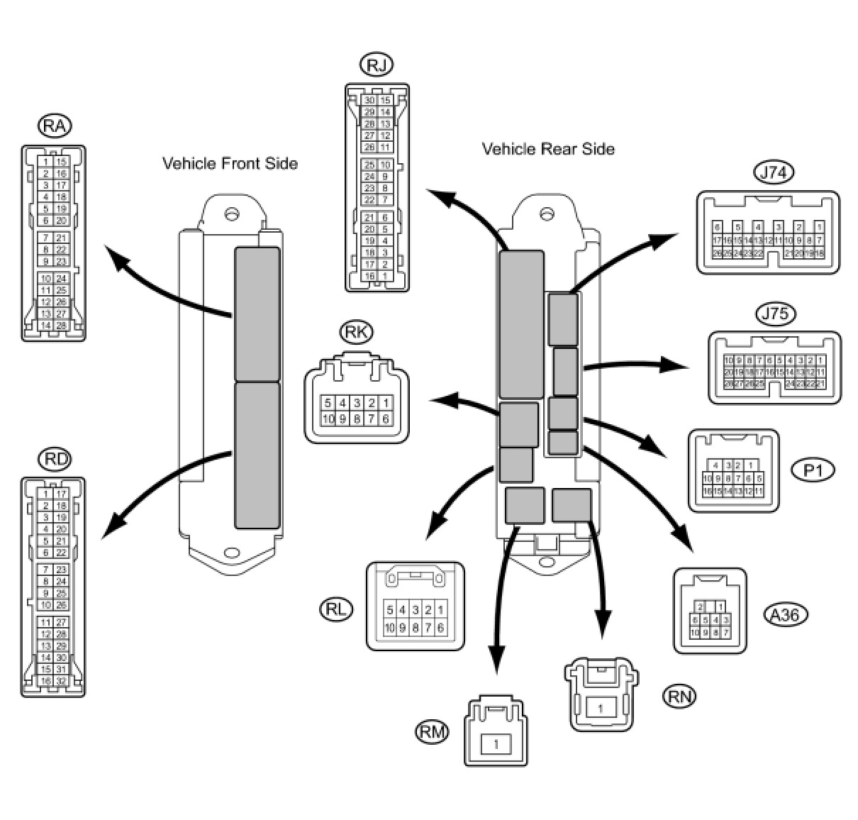(a) Disconnect the RD, RK and RN main body ECU RH (cowl side junction block RH) connectors.