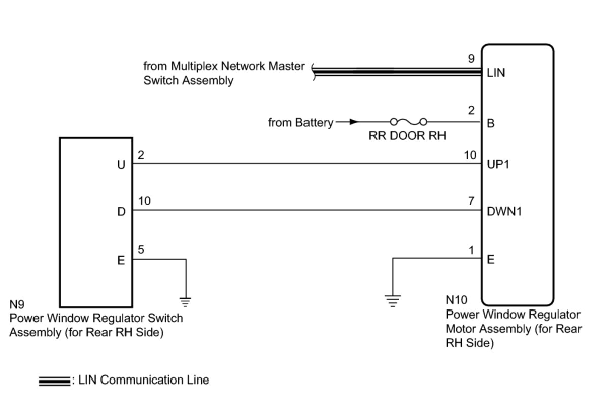 - When the ECU determines that the power window regulator motor assembly (for rear RH side) has a malfunction, DTC B2311 is set.