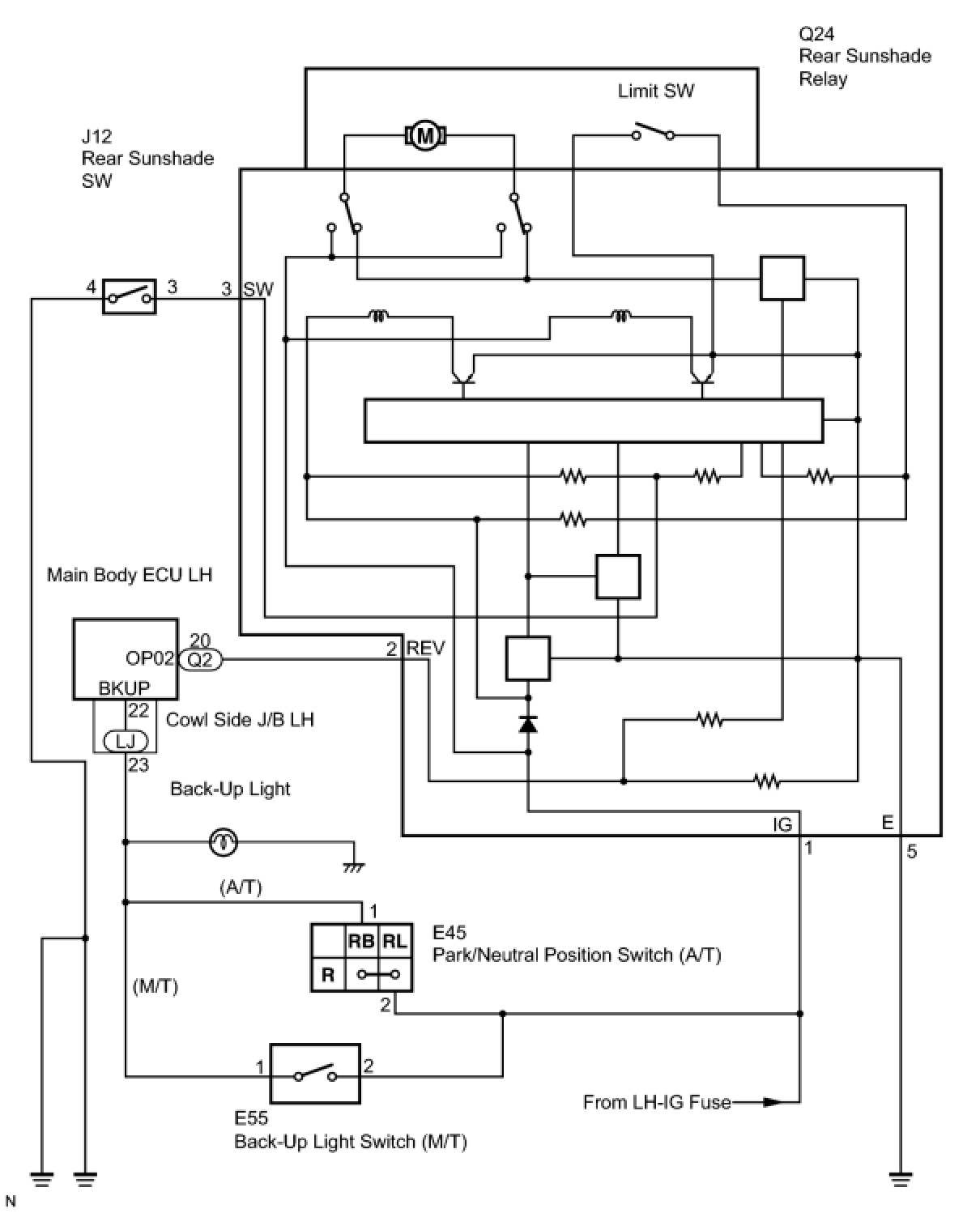 When the engine switch is on (IG) and the rear sunshade is raised, moving the shift lever to R causes the Park/Neutral Position switch (A/T) or back-up light switch (M/T) to send a reverse-linked signal to the main body ECU LH. Then the main body ECU LH sends the signal through the multiplex communication line to the rear sunshade relay. The relay then lowers the rear sunshade.