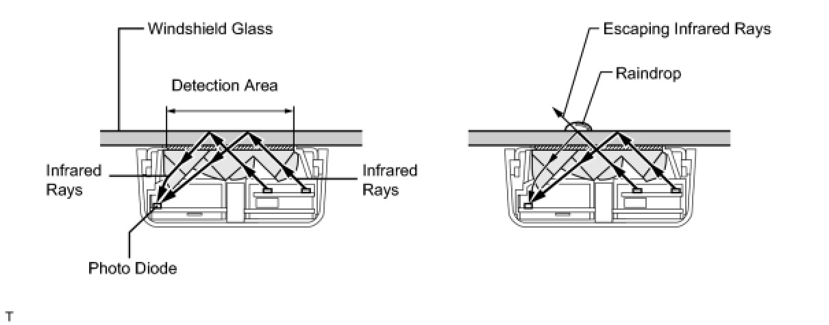 - If raindrops are present in the detection area, a portion of the emitted infrared rays penetrate the windshield glass due to the change in the difference of the index of refraction between the glass and the area outside the windshield (difference between air and water). The ability of the windshield glass to reflect the emitted rays back inside change due to the presence of raindrops. This reduces the amount of infrared rays that are received by the photo diode. The amount of this reduction is then used to determine the amount of raindrops. Thus, this function selects the INT, LO, and HI wiper operation in order to operate the wipers at an optimal speed and timing.