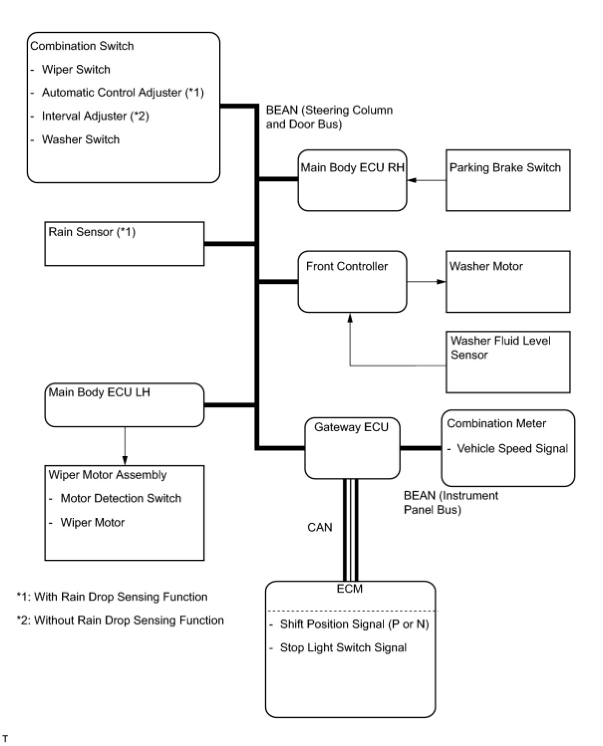 - The main body ECU LH adjusts the wiper timing based on commands from the rain sensor. These adjustments are based on vehicle speed and a determination of the vehicle driving and stopping conditions during automatic operation.