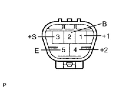 (1) Connect the positive (+) battery lead to terminal 4 (+2) of the connector, and the negative (-) battery lead to terminal 3 (+S), and check that the motor operates at high speed.