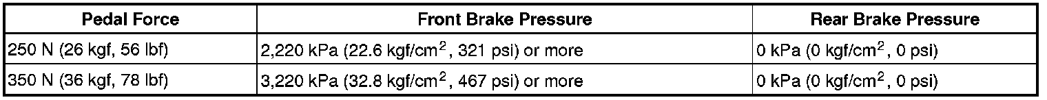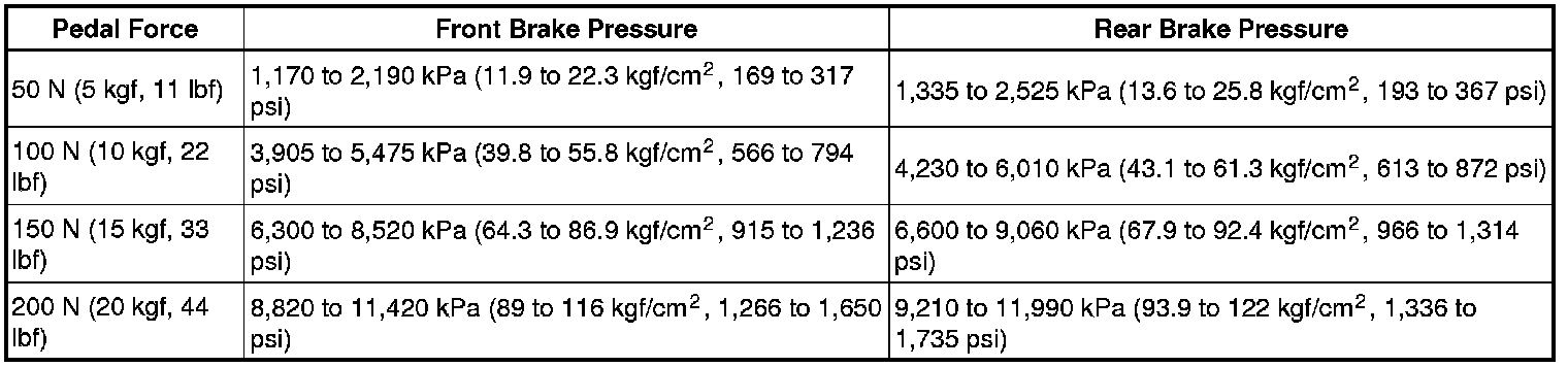(2) Depress the brake pedal (see table below) and check the fluid pressure.