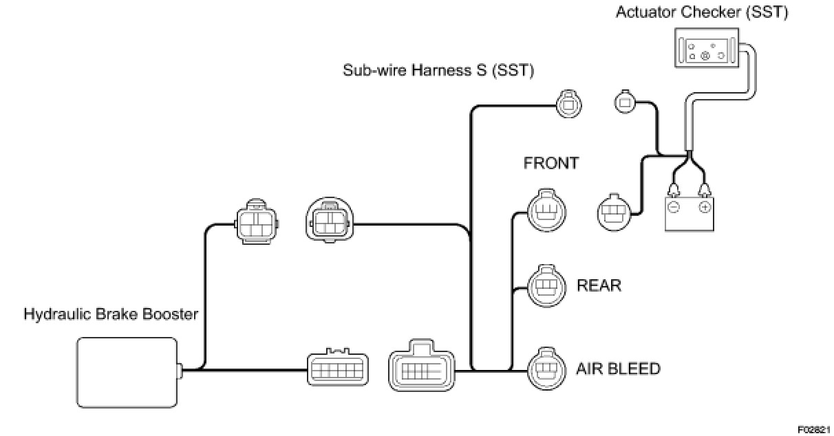 (c) Connect the actuator checker (SST) to the hydraulic brake master cylinder side wire harness via the sub-wire harness S (SST), as shown in the illustration below.