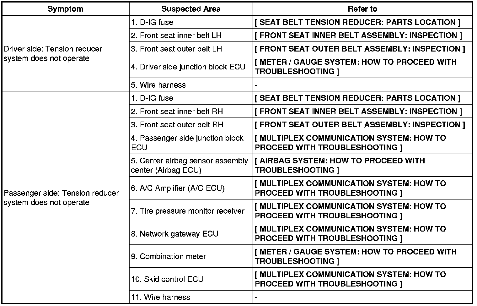 SEAT BELT: SEAT BELT TENSION REDUCER: PROBLEM SYMPTOMS TABLE