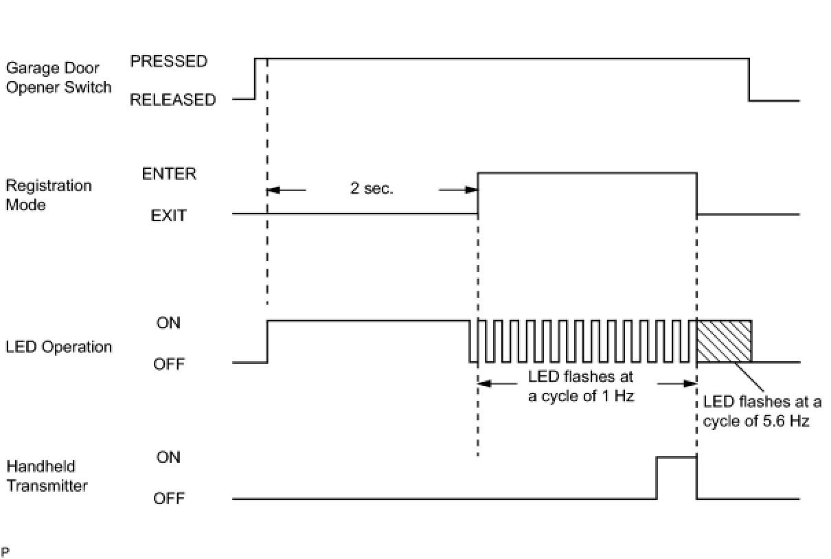 The garage door opener system LED should stay on while holding the selected switch for the 2 second period. After entering registration mode, the LED will flash approximately 1 time per second (1 Hz). This indicates that the garage door opener system has entered registration mode and is "listening" for a code from a handheld transmitter.